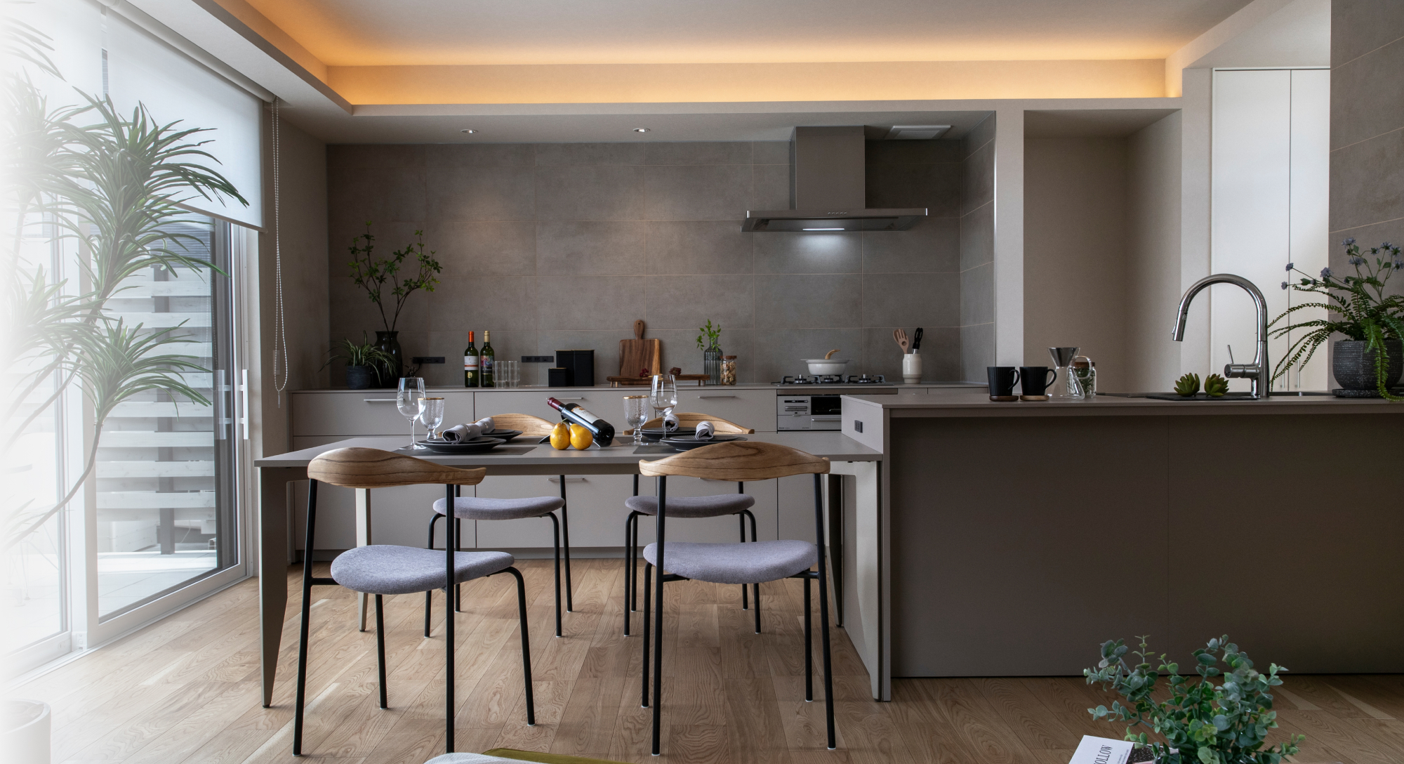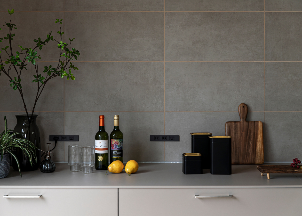キッチンの背面や造作の洗面台にはタイルをあしらって質感豊かに。特にキッチンは、落ち着いた色味の大判タイルでモダンに設らえた。生活感が出がちなコンセントカバー等も、色や形でシックに統一。