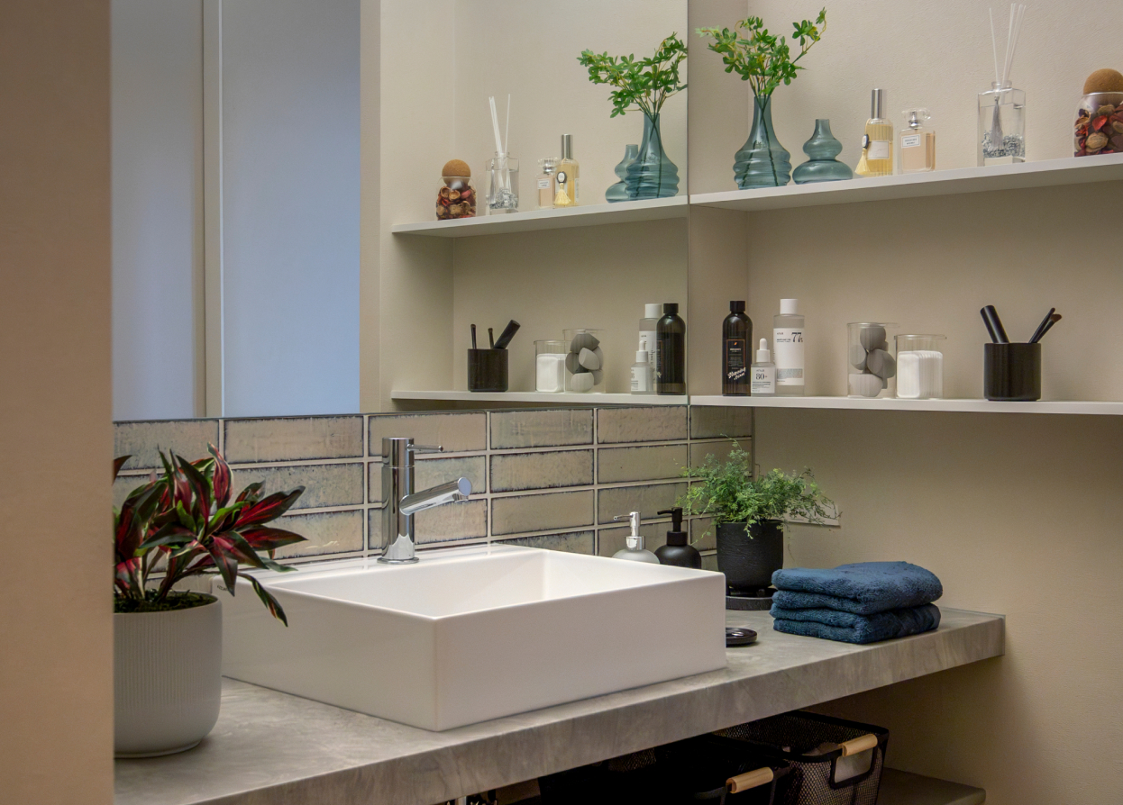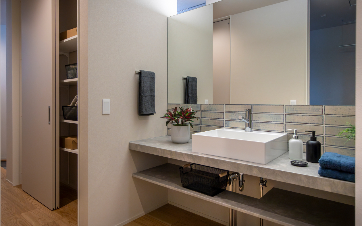 通路を生かした洗面スペースは、上部を開口にして圧迫感を感じさせない工夫が。右手側にはオープン棚があり、グリーンやお気に入りのケアアイテムを置ける。奥には扉付きの大型収納があり、隠したいものはここへ。