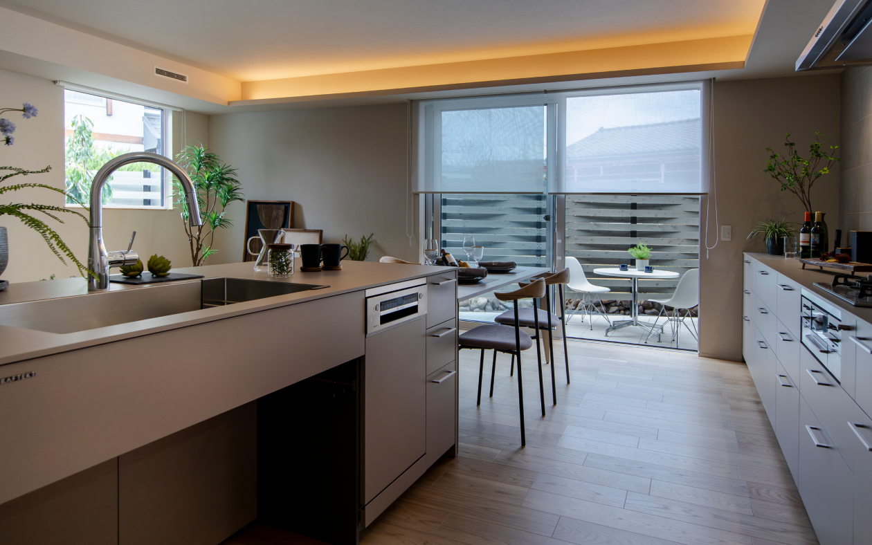 例えば会話しながら楽しく食事ができるよう、キッチンやダイニングはほど良いゆとりを意識し、家事導線もしっかり確保。