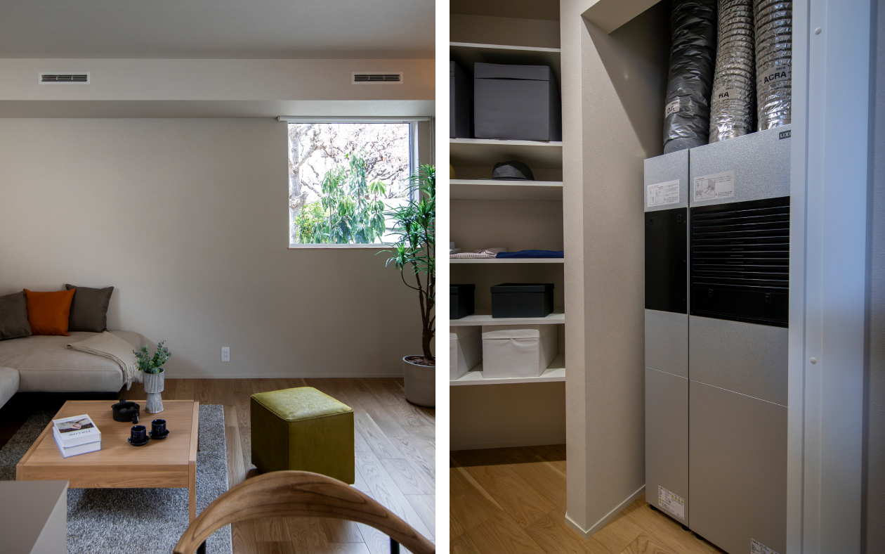 高性能住宅のスペックを最大限に活かす全館換気空調システムが、LIXILの「エコエアFine」HEAT20 G2グレード相当以上を想定し、4.0kwの出力で全館をカバー。設置は省スペースで、メンテナンスも容易だという。