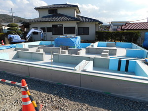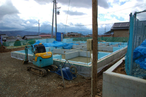 現在は基礎工事と設備配管が終了し、次に上棟作業に入るところです。