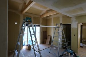 こちらの現場は外壁作業が完了、内部はボード張り作業が行われていました。