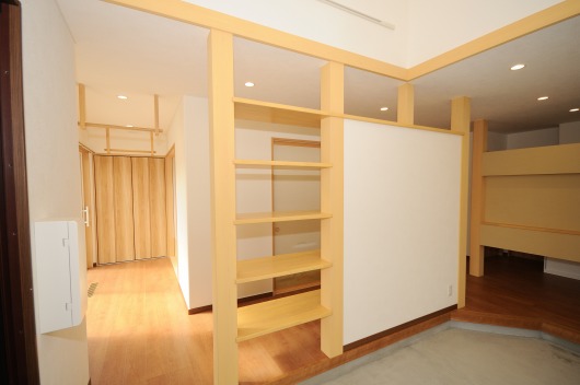 玄関正面には「目隠し壁」、廊下には大きな「本棚」を備え付けました。